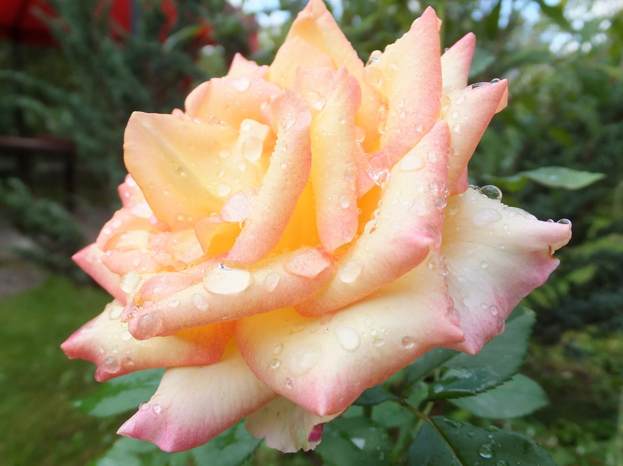 Чайно-гибридная роза Амбианс (Ambiance) – это воплощение элегантности и утонченности. Этот сорт розы привлекает внимание своими крупными, густомахровыми цветками, которые переливаются оттенками розового, персикового и кремового. Каждый бутон раскрывается в изысканный цветок диаметром до 12 см, источающий нежный, сладковатый аромат.